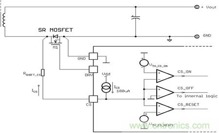 CS_OFF比較器是非常精密的真正的零比較器,通過同步整流將系統(tǒng)能效提升至最高。NCP4305的CS腳和SR MOSFET(M1) 之間的電阻用來調(diào)節(jié)關(guān)斷電流。當(dāng)CS腳電壓低于VTH_CS _ON閾值時(shí),M1 導(dǎo)通;當(dāng)CS腳電壓高于VTH_CS _OFF閾值時(shí),M1關(guān)斷。
