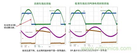 在CCM應(yīng)用中,當(dāng)初級端MOS管導(dǎo)通時(shí),通過隔離驅(qū)動器強(qiáng)制使次級端MOS管關(guān)斷;當(dāng)初級端MOS管關(guān)斷, TRIG腳功能使次級端MOS管導(dǎo)通。這種交替導(dǎo)通特性大大提高系統(tǒng)能效。如圖5所示,無觸發(fā)功能的初級端和次級端驅(qū)動信號交疊的時(shí)間為40 ns,遠(yuǎn)大于帶觸發(fā)功能的12 ns,也就是說,觸發(fā)功能將縮短延遲時(shí)間,從而降低損耗。
