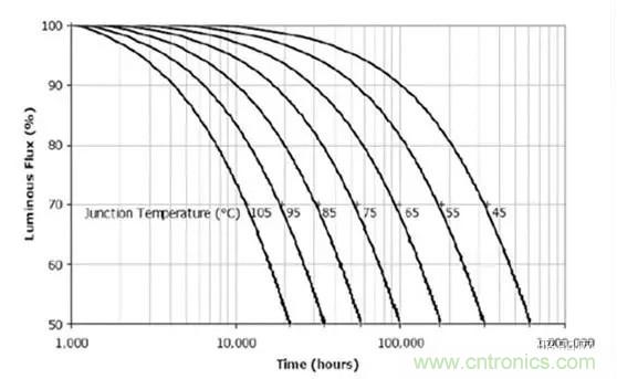 那么泡殼內(nèi)的環(huán)境溫度能夠允許105度嗎?只要看一下下面的一個(gè)圖片就知道了。那是美國Cree公司有關(guān)LED芯片結(jié)溫和光衰之間的關(guān)系。
