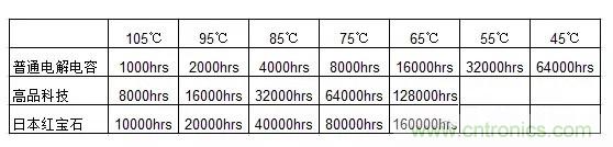 3、各種壽命的電解電容在45℃的環(huán)境溫度下的實(shí)際壽命