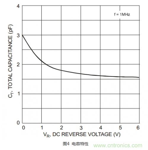 首先,我們熟悉下二極管的電容特性:圖4所示的是IN4448HWS二極管的電容特性。零反向偏壓下,電容是3pF,隨著反向偏壓越來越大,結(jié)電容越來越小。