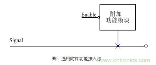 在高速信號(hào)線上,通常會(huì)附加一些功能,這些功能通常會(huì)帶來不利的影響,如會(huì)產(chǎn)生很大的寄生電容,這個(gè)電容視具體的電路模塊而定。如果忽略這個(gè)電容,可能會(huì)影響這個(gè)信號(hào)的頻率。最不幸的是,就算您注意到了這個(gè)電容,由于附加的功能模塊產(chǎn)生的電容太大,似乎也無能為力。通用附件功能接入法如圖5所示: