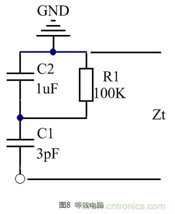 不管正向還是反向接入法,其等效電路都如圖8所示。我們假設(shè)二極管的節(jié)電容為3pF,附件功能模塊寄生總電容1uF。如果電阻足夠大,那么可以忽略,此時(shí)就是兩個(gè)電容串聯(lián),和電阻并聯(lián)類似,CT=C1*C2/(C1+C2)≈C1(C2較大)。大電容就算變化很大,串聯(lián)總電容幾乎等于小電容,即3pF,有效減小接入電容。