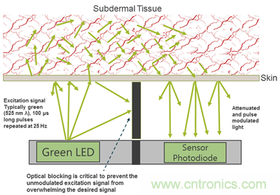 圖1展示了測量心率信號的基本方法,它依賴于用光學(xué)方法從人體組織上提取的心率壓力波。圖1說明了光進(jìn)入皮膚后傳輸?shù)耐緩剑河尚穆蕢毫Σㄒ鸬拿?xì)血管舒張和收縮運動對由綠色LED注入人體組織的光信號進(jìn)行了調(diào)制。接收到的信號因為通過了皮膚而被大大地衰減,它被一個光電管接收并送到電子子系統(tǒng)中去處理。源自脈搏的振幅調(diào)制信號被檢測(過濾掉運動噪聲)、分析和顯示。