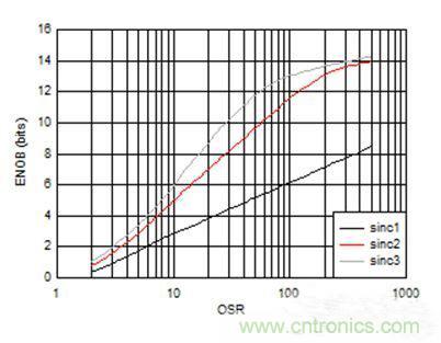 圖1:AMC1304L05 —— 有效位數(shù)和過(guò)采樣率