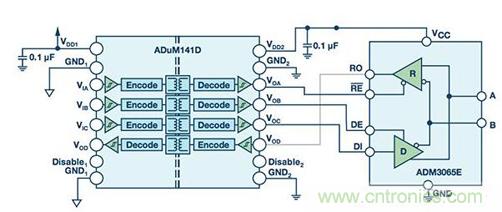 RS-485信號(hào)傳輸是平衡的差分式傳輸,本身便能抗干擾。系統(tǒng)噪聲均等地耦合到RS-485雙絞線電纜中的每條導(dǎo)線。一個(gè)信號(hào)的發(fā)射與另一個(gè)信號(hào)相反,耦合到RS-485總線的電磁場(chǎng)彼此抵消。這降低了系統(tǒng)的電磁干擾(EMI)。此外,ADM3065E增強(qiáng)的2.1 V驅(qū)動(dòng)強(qiáng)度支持在通信中實(shí)現(xiàn)更高的信噪比(SNR)。給ADM3065E增加信號(hào)隔離可利用ADuM141D輕松實(shí)現(xiàn)。ADuM141D是一款采用ADI公司iCoupler®技術(shù)的四通道數(shù)字隔離器。ADuM141D的工作數(shù)據(jù)速率最高可達(dá)150 Mbps,因此它適合與50 Mbps ADM3065E RS-485收發(fā)器一起工作(參見圖2)。直接功率注入(DPI)法測(cè)量器件抑制注入到電源或輸入引腳的噪聲的能力。ADuM141D采用的隔離技術(shù)已通過測(cè)試,符合DPI IEC 62132-4標(biāo)準(zhǔn)。ADuM141D抗擾度性能超過同類產(chǎn)品。ADuM141D在整個(gè)頻率范圍內(nèi)保持了出色的性能,而其他隔離產(chǎn)品在200 MHz至700 MHz頻段出現(xiàn)位錯(cuò)誤。