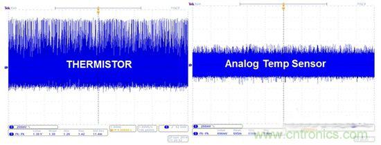圖6:熱敏電阻與模擬溫度傳感器在連接到開關(guān)穩(wěn)壓器時的噪聲實驗
