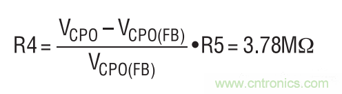 串聯(lián)連接的超級(jí)電容器上的滿充電電壓被設(shè)定為5V。這是利用位于 CPO 引腳與 CPO_FB 引腳之間的一個(gè)分壓器網(wǎng)絡(luò)完成的。R5 設(shè)定為 1.21M,并計(jì)算 R4阻值。VCPO(FB)為1.21V。