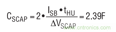 在后備模式中,當(dāng)超級(jí)電容器組上的電壓開(kāi)始接近VOUT 時(shí),在計(jì)算 tHU 結(jié)束時(shí)超級(jí)電容器上的最小電壓必須將兩個(gè)超級(jí)電容器的 ESR 和 LDO 的輸出電阻考慮在內(nèi)。假設(shè)每個(gè)超級(jí)電容器的 ESR 為 100mΩ,而 LDO 輸出電阻為 200mΩ,這將由于 50mA 待機(jī)電流的原因而使VOUT (MIN)增加20mV。VOUT (MIN)設(shè)定為3.1V,從而在超級(jí)電容器組上產(chǎn)生一個(gè)1.88V的放電電壓 (?VSCAP)。現(xiàn)在,可以確定每個(gè)超級(jí)電容器的大小。