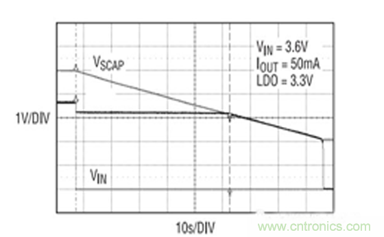圖 1 示出了一款采用超級(jí)電容器組的電源保持系統(tǒng),該電容器組在沒(méi)有電池電源的情況下提供持續(xù)約45s 的 165mW 待機(jī)功率的容量。一個(gè) LDO 負(fù)責(zé)在后備模式期間將超級(jí)電容器組的輸出轉(zhuǎn)換為一個(gè)恒定電壓電源。