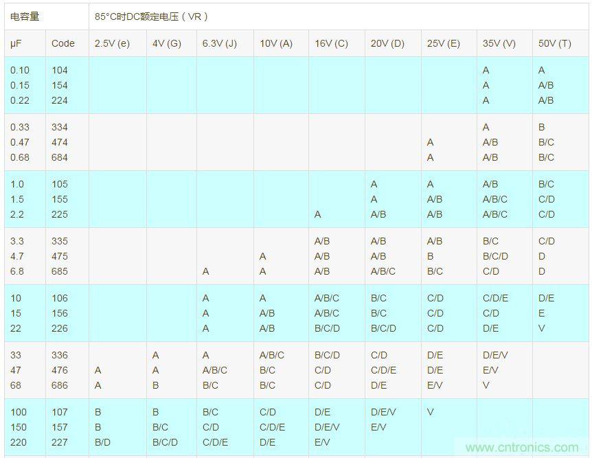 AVX 常規系列(TAJ)貼片鉭電容:容量和額定電壓(字母表示封裝大?。?/div>