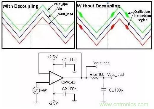 要回答這個(gè)問題,需要考證在不使用去耦器件時(shí)會出現(xiàn)什么問題。 圖 1 為帶去耦電容器和不帶去耦電容器(C1 和C2)情況下用于驅(qū)動 R-C 負(fù)載的緩沖電路。我們注意到,在不使用去耦電容器的情況下,電路的輸出信號包含高頻 (3.8MHz) 振蕩。對于沒有去耦電容器的放大器而言,通常會出現(xiàn)穩(wěn)定性低、瞬態(tài)響應(yīng)差、啟動出現(xiàn)故障以及其它多種異常問題。