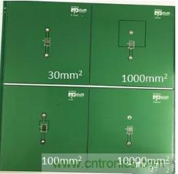 圖1:四種不同散熱銅皮尺寸的PCB布局