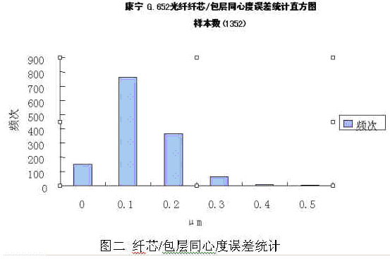 對于原材料之一的緊套光纜及光纖,成都康寧光纜全部采用美國康寧產光纖,依托康寧公司全球領先的光纜制造技術,制造出國內領先水平的緊套光纜,并用之于本公司的連接器跳線的生產,確保光纖光纜原材料的品質。圖二和圖三即是本公司采用的康寧公司G652光纖的主要特性參數,其纖芯/包層同心度誤差和衰減系數統計值均遠好于國內相關行業標準的要求(行業標準的要求分別為≤0.5μm和≤0.5dB/km):