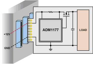 考慮一個具有12 V背板及一組可移除模塊的系統。每個模塊必須能在不影響任意相鄰模塊正常工作的條件下被移除和替換。當沒有控制器時,每個模塊可能會對電源線造成較大的負載電容,通常在毫法量級。首次插入一個模塊時,其未充電的電容需要所有可用的電流來對其進行充電。如果不對這個浪涌電流加以限制,這個很大的初始電流將會降低端電壓,導致主背板上的電壓大幅下降,使系統中的多個鄰近模塊復位,并破壞模塊的連接器。