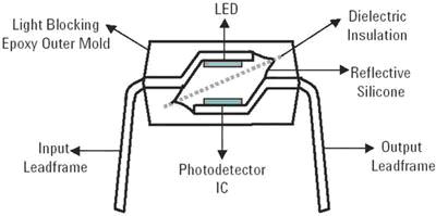光學耦合器的工作基礎是LED發出的光通過透明的絕緣介質到光電探測器,這種介質提供2.5kV-6kV范圍的高壓絕緣。光耦合程度取決于光導材料。絕緣將通過光導材料本身或通過額外的光傳導介電材料實現。在任何情況下,LED的排列、光導材料、介電材料和IC都會直接影響光耦合和高壓絕緣的性能。