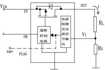 圖2是一種帶過流保護(hù)的負(fù)載開關(guān)結(jié)構(gòu)框圖,圖2中,RL是負(fù)載,RS是電流檢測電阻。流過RS的電壓降VRS與電流I成比例,此電壓VRS輸入負(fù)載開關(guān)VI端。若內(nèi)部電流檢測電路檢測出有過流狀態(tài),輸出過流信號(電平信號)給通、斷控制電路,關(guān)斷負(fù)載開關(guān)。