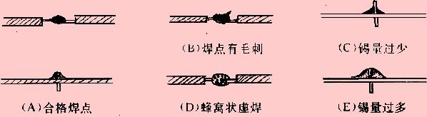 (A)所示應(yīng)是錫點光亮,圓滑而無毛刺,錫量適中。錫和被焊物融合牢固。不應(yīng)有虛焊和假焊。