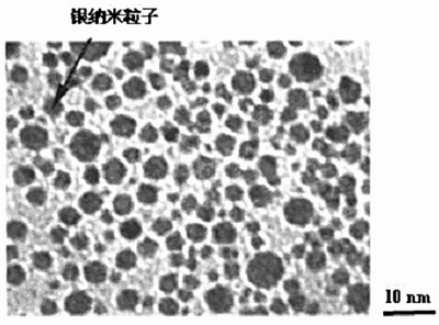 由于納米粒子表面呈活性,為防止其自身凝聚必須要做表面控制。我們所用的納米粒子是平均直徑為10nm左右的銀納米粒子,其表面用有機物保護層進行了涂覆。圖3為有機物—銀復合納米粒子的掃描電鏡圖像,圖4為其結構模式圖。