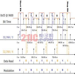 UART數(shù)據(jù)用10,922波特或8,192波特的UART接收。由于UART在傳輸中間點(diǎn)對數(shù)據(jù)進(jìn)行采樣以補(bǔ)償抖動,因此該點(diǎn)已經(jīng)被選擇為接收UART的采樣點(diǎn)。在沒有行抖動的理想情況下,10,922波特UART對第三數(shù)據(jù)位的開始兩次讀數(shù)都會是錯誤的而8,192波特的UART由于會完全遺漏第三位,很快就將出錯。由于低功耗應(yīng)用的理想時鐘是低功耗實時時鐘模式,這使得在低功耗環(huán)境中處理很困難。解決這一問題的最好辦法就是將µC與調(diào)制技術(shù)結(jié)合使用,用32kHz振蕩器提供非常精確的2,400波特,并完全能支持9,600波特(參見圖3)。