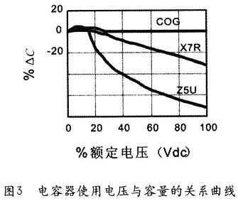 ①電容器的使用電壓對電容器的電容量有影響,穩(wěn)定性低的介質(zhì),在施加額定工作電壓后容量會大幅度下降(見圖3),以至達不到使用效果,這一點在選擇電容器時必須給以充分注意(不能一味追求大容量和小體積,必須在容量和使用電壓上留有充分余地)。