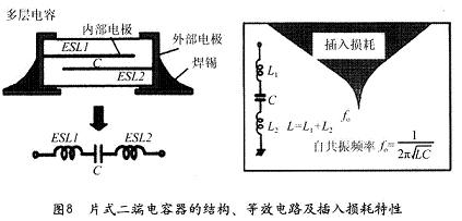 應(yīng)該說片式二端電容器的出現(xiàn)對于改進普通引線式電容器的自諧振問題是很有好處的,因為片式二端電容器的引線長度得到了最大限度縮減。但由于電容器內(nèi)部的構(gòu)造,并不能夠消除內(nèi)部電極的殘留電感,這樣當(dāng)頻率達到使電容器的容抗XC同殘留電感的XL的絕對值相等時,二端電容依然會產(chǎn)生自諧振,參見圖8。由于自諧振頻率的存在,當(dāng)噪聲的頻帶超過自諧振頻率之后,噪聲的抑制效果會急速下降。但是與普通有引線的二端電容相比較,還是有很大改進。