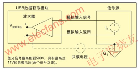 圖6:差分輸入被隔離,通過(guò)提供未連到大地的參考地源點(diǎn)消除了共模電壓誤差。