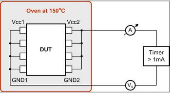 實際上,周圍溫度維持在150oC時,TDDB由隔離器的施加應力電壓決定(請參見圖5)。測試之初便激活一個計時器,其在隔離器電流超出1mA時停止,表明電介質擊穿。記錄每個測試電壓的故障時間,并根據理論E模型曲線進行繪圖。