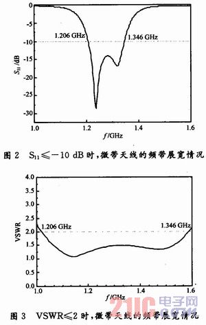 此外,從圖2,圖3中還可以看到,在工作的頻帶范圍內有2個諧振頻點,這是由上,下2個貼片各自諧振而引起的,可見雙層貼片可以產生兩個諧振點,進而可以有效地達到展寬微帶天線頻帶的目的。