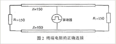 ②阻抗不連續(xù),顧名思義,與光從一種媒質(zhì)進(jìn)入另一種媒質(zhì)時(shí)所引起的反射是相似的。信號在傳輸線末端突然遇到電纜阻抗很小甚至沒有,信號在這個(gè)地方就會引起反射。消除這種反射最常用的方法,是在電纜的末端跨接一個(gè)與電纜的特性阻抗同樣大小的終端電阻,使電纜的阻抗連續(xù)。由于信號在電纜上的傳輸是雙向的,因此,在通訊電纜的另一端同樣要跨接一個(gè)相同大小的終端電阻,如圖2所示。