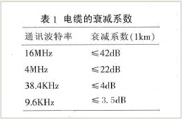 導(dǎo)線的電阻對信號的影響很小,可以忽略不計(jì)。電纜的分布電容C主要是由雙絞線的兩條平行導(dǎo)線產(chǎn)生。信號的損失主要是由于電纜的分布電容和分布電感組成的LC低通濾波器。通訊波特率越高,信號衰減也會越大。常規(guī)電纜的衰減系數(shù)見表1.