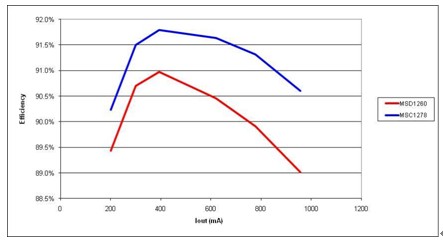 圖5 由于更少的電流,高漏電感(MSC1278) 產生更高的效率