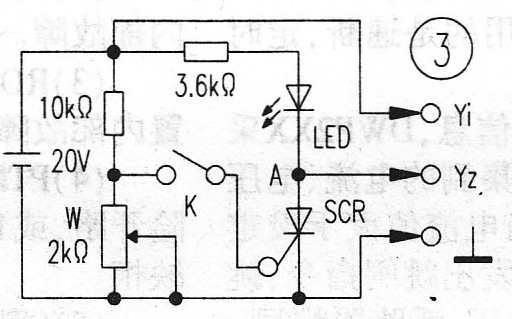 測試方法:示波器輸人耦合開關置“DC”擋,Y軸衰減開關置5V/cm。當開關K未閉合時,控制端未加控制電壓,則SCR不導通,回路電流幾乎為零,示波器屏上顯示的A點壓VA≈20V。合上開關K,調節電位器W的阻值(由小到大),直到可控硅導通為止,此時發光二極管LED亮,VA急劇下降(可控硅導通后的VA≈0.7V)。此時斷開開關K,則SCR繼續導通,LED仍亮,屏上顯示的電壓仍保持在0.7V左右,若要SCR截止,只有切斷電源才行。