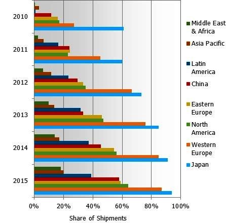 2010~2015年全球連網電視出貨比例,按區域市場