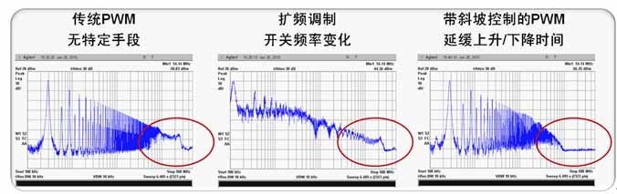 要滿足智能手機(jī)揚(yáng)聲器放大器的這些期望性能要求,D類放大器是極佳選擇。如D類放大器提供極低EMI,避免與其它RF電路產(chǎn)生干擾。實(shí)際上,D類放大器將輸入的模擬音頻信號(hào)轉(zhuǎn)換為脈寬調(diào)制(PWM)的脈沖信號(hào),再以此脈沖信號(hào)控制開關(guān)器件來導(dǎo)通/關(guān)閉音頻功率放大器。對(duì)于智能手機(jī)應(yīng)用而言,要降低音頻輸出段的EMI,重要的是減少較高頻率的頻譜部分。傳統(tǒng)PWM技術(shù)沒有特定手段來應(yīng)對(duì)。但要做到這一點(diǎn),可以采用兩種技術(shù),一是PWM擴(kuò)頻調(diào)制(開關(guān)頻率變化),一是帶斜坡控制的PWM(延緩上升/下降時(shí)間)。相比較而言,斜坡控制技術(shù)比擴(kuò)頻調(diào)制技術(shù)在減少較高頻率的頻譜方面更為有效,更有利于降低EMI。
