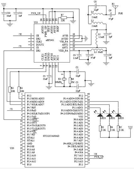 nRF2401 是一個單片無線收發(fā)一體芯片,工作在2.4GHz ISM 頻段,完全集成功率合成器、功率放大器、晶體振蕩器和調(diào)整電路。采用QFN24 5×5 毫米封裝,應(yīng)用電路使用外圍元件少(見圖2);采用FSK 調(diào)制方式,125 個頻道,能滿足多頻及跳頻需要;傳輸速率高達(dá)1Mbps,具有高數(shù)據(jù)吞吐量;功耗低,電源電壓1.9V~3.6V 滿足低功耗設(shè)計需要;芯片內(nèi)部設(shè)有專門穩(wěn)壓電路,使用各種電源包括DC/DC 開關(guān)電源均有較好的通信效果。
