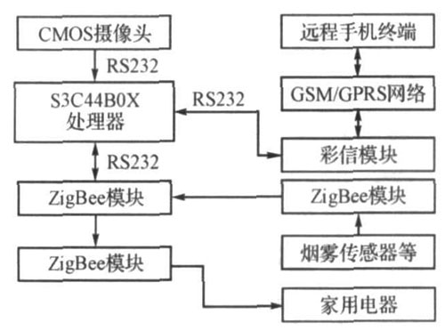 本系統采用模塊化設計方案。以嵌入式系統主板為核心,通過CMOS攝像頭對關鍵部位進行安全監測,通過手機傳遞安全信息和圖像彩信,并對家用電器進行遠程控制,利用ZigBee模塊實現家用電器、系統主板和煙霧、溫度、煤氣等傳感器的無線聯網。