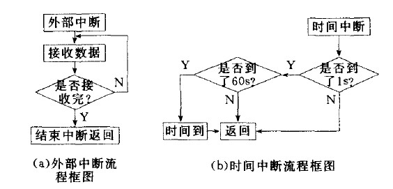 為了確保主機正常工作。加入主機等待分機回復的等待時間。而為了時間的實時性和準確性,用到單片機內部的定時器1.設定其工作模式為模式1,初值為Ox4bff(5Oms)。中斷20次為1s,60次循環為60s,當60s到時,標志位置位后返回。時間中斷流程圖如圖7(b)所示。