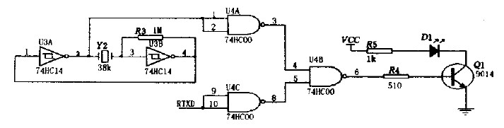 紅外接收器電路如圖4所示,當接收器收到數位"O"時,Q2管導通,使得RXD接收到低電平,收到數位"1"時,Q2管截至,RXD接收到高電平。
