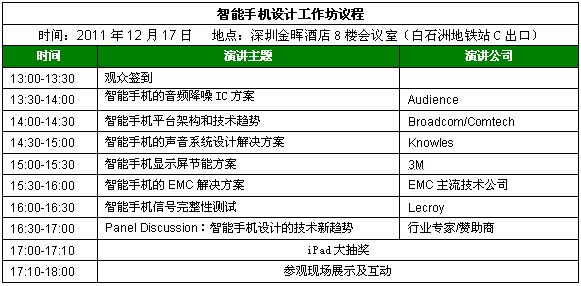 - 智能手機(jī)設(shè)計(jì)工作坊將于2011年12月17日下午在深圳金暉酒店召開