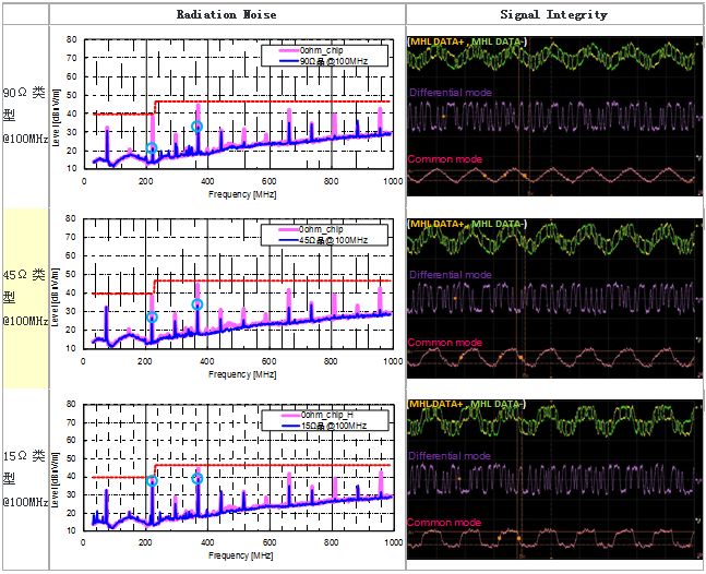 圖5顯示的MHL信號線使用各種共模扼流線圈時的輻射噪聲/信號波形評測結果。共模扼流線圈在產生噪聲的30MHz~1GHz頻率段內,按照阻抗由高到低的順序,分別使用以下3種類型(90Ω、45Ω、15Ω@100MHz) (靜態特性請參考圖6) 來進行測量。