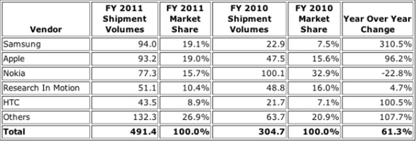 三星在第4季度完成了一系列重大的成就:首次突破了3000萬臺的銷量大關(guān),成為了各大智能手機企業(yè)同比增長最快的企業(yè),同時在2011年成為了智能手機整體市場的領(lǐng)頭羊。其Galaxy系列智能手機的市場份額進一步擴展,先后推出了針對高端市場的Galaxy S II和Galaxy Nexus,以及針對大眾市場的Galaxy Ace以及Galaxy Y等。同時該公司還在Windows Phone Mango的基礎(chǔ)上更新了其Omnia和Focus等產(chǎn)品。