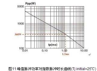 以SMAJ24A為例,從產品數據表摘取這些參數與圖11的曲線進行比較,發現SMAJ24A符合ISO7637-2脈沖2測試的要求,可承受長達1.2ms的360 W指數脈沖,這個數值遠遠高于ISO7637-2脈沖2電涌強制的4μs時長。
