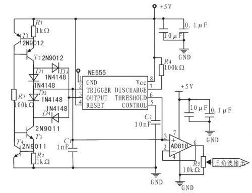 方案①:利用NE555產(chǎn)生三角波。該電路的特點是采用恒流源對電容線性沖、放電產(chǎn)生三角波,波形線性度較好、頻率控制簡單,信號幅度可通過后加衰減電位器控制。
