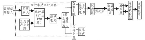 方案①:數(shù)字方案。輸入信號經(jīng)前置放大調(diào)理后,即由A/D采入單片機(jī)進(jìn)行處理,三角波產(chǎn)生及與音頻信號的比較均由軟件部分完成,然后由單片機(jī)輸出兩路完全反向的PWM波給入后級功率放大部分,進(jìn)行放大。此種方案硬件電路簡單,但會引入較大數(shù)字噪聲。