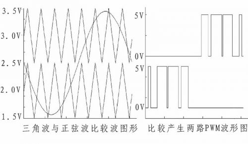 雙路比較器電路采用低功耗、可單電源工作的雙路比較器芯片LM393構(gòu)成。此處為提高系統(tǒng)效率,減少后級H橋中CMOS管不必要的開合,用兩路偏置不同的三角波分別與音頻信號的上半部和下半部進(jìn)行比較,產(chǎn)生兩路相互對應(yīng)的PWM波信號給后級驅(qū)動電路進(jìn)行處理,雙路比較波形圖如圖3所示。此處值得注意的是將上半部比較處理為音頻信號接比較器的負(fù)向端、三角波信號接正向端;下半部比較則相反,這樣形成相互對應(yīng),在音頻信號的半部形成相應(yīng)PWM波時,另半部為低電平,可保征后級H橋中的CMOS管沒有不必要的開合,以減少系統(tǒng)功率損耗。利用電位器將上半部比較三角波偏置調(diào)至3 V,下半部比較三角波偏置調(diào)至2 V.還需注意,三角波信號應(yīng)比需比較范圍內(nèi)的音頻信號幅度稍大一些,且偏置調(diào)節(jié)要較準(zhǔn)確,以防音頻信號某些點比較不到,后續(xù)濾波還原原信號時產(chǎn)生失真。