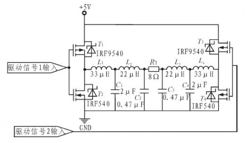 H橋互補(bǔ)對稱電路如圖4.采用低導(dǎo)通電阻、開關(guān)速率快、受溫度影響小的場效應(yīng)對管IRF9540和IRF540組成互補(bǔ)推挽放大電路。運用對稱輸出方式,充分利用電源電壓,浮動輸出載波峰峰值量大可達(dá)10 V,有效地提高了輸出功率。