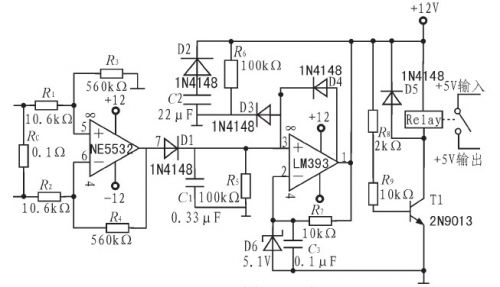 經(jīng)過放大后的信號經(jīng)過由D1、C1、R5組成的峰值檢波部分,檢出信號幅度值送至比較器與設(shè)定的基準(zhǔn)電壓進(jìn)行比較。比較器選用低功耗、響應(yīng)速度較快的雙路比較芯片LM393.比較器負(fù)端用穩(wěn)壓管D6及C3、R7設(shè)置為5.1V,比較器接成遲滯比較方式,一旦過流,即可自鎖。此時比較器輸出的高電平使三極管T1導(dǎo)通,繼電器的地控制端與地聯(lián)通,繼電器吸合,切斷功放部分的供電,達(dá)到保護(hù)目的。因比較器自鎖,所以在解決過流問題后,關(guān)斷保護(hù)模塊的電源,才能重新進(jìn)入保護(hù)狀態(tài)。D2、D3、R6、C2組成開機(jī)延時電路,在斷電后,C2通過D2快速放電,防止開始瞬間C2上的殘余電壓對3號腳影響,防止比較器在非正常狀態(tài)下進(jìn)入自鎖狀態(tài),使保護(hù)模塊不能發(fā)揮正常作用。