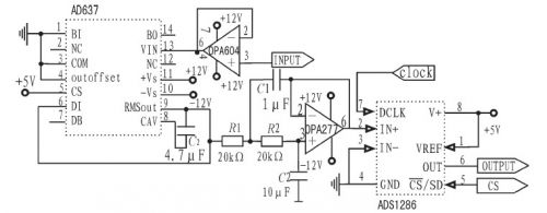 輸入綴用OPA604構(gòu)成一射極跟隨器已達(dá)到隔離前后級的作用。改變平均電容的值可設(shè)定平均時間常數(shù),并決定低頻準(zhǔn)確度、輸出波紋的大小和穩(wěn)定時間。交流波紋分量可以用增大此電容的值來減少,但這樣會使建立時間增大,所以選擇用后接一個二階有源低通濾波器的方法來減少輸出的紋波。得出真有效值后直接給入ADS1286進(jìn)行模數(shù)轉(zhuǎn)換,再由FPGA處理,計算出系統(tǒng)的輸出功率并進(jìn)行顯示。