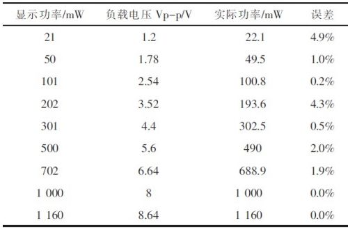 1)功率顯示誤差測量用Agilent信號源給出輸入音頻信號,示波器在單端輸出測試點測負(fù)載上電壓峰值Vo,據(jù)式計算出實際功率,進(jìn)而計算出顯示誤差,結(jié)果見表1所示。